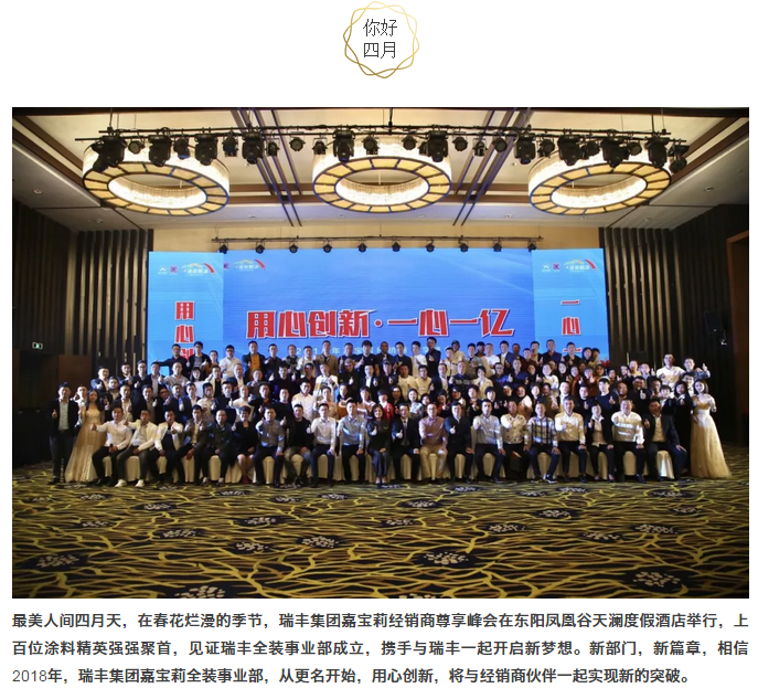 最美人间四月天,在春花烂漫的季节,瑞丰集团嘉宝莉经销商尊享峰会在东阳凤凰谷天澜度假酒店举行,上百位涂料精英强强聚首,见证